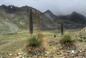 (_Puya raimondii_). Conocida comúnmente también como la “reina de las puyas” o “planta de las nieves”. Especie botánica endémica de la Cordillera de los Andes, particularmente en Perú y Bolivia, ...